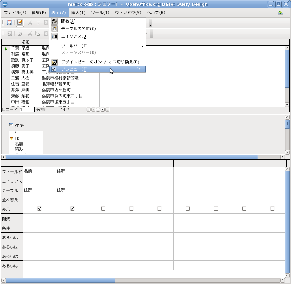 「住所」から名前と住所だけを取り出すクエリーを作ります。