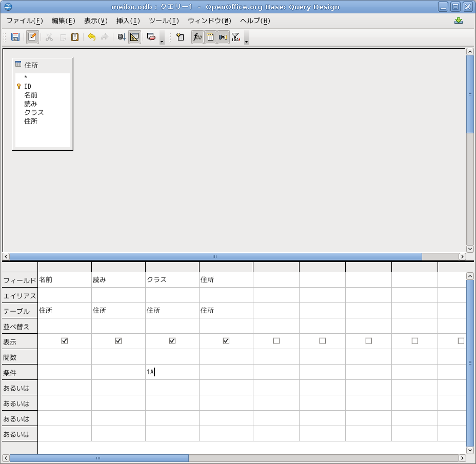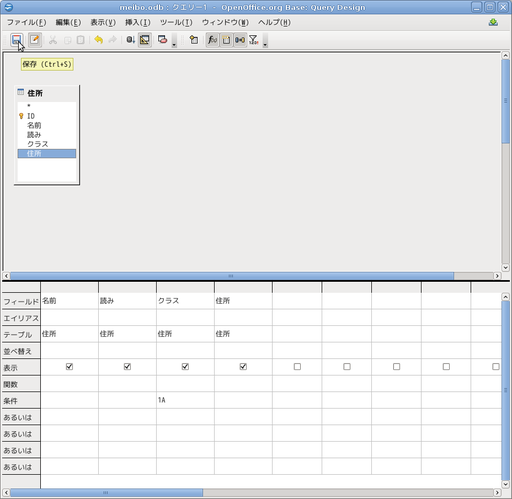 「住所」から1Aクラスだけを取り出すクエリーを作ります。