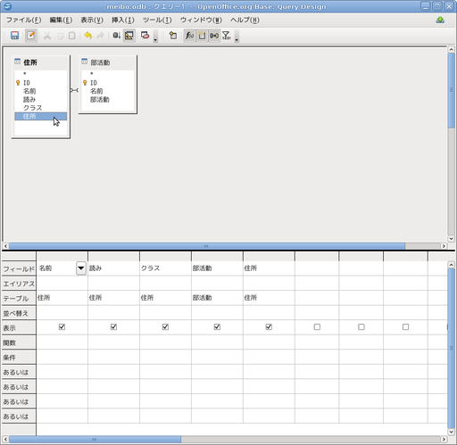 先ほどと同様に、「住所」の表を追加して、名前、よみ、クラス、住所の属性を必要な順番にダブルクリックして、下半分に書き入れます。