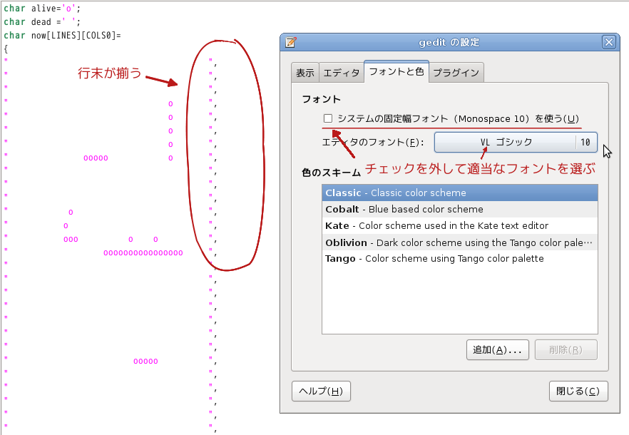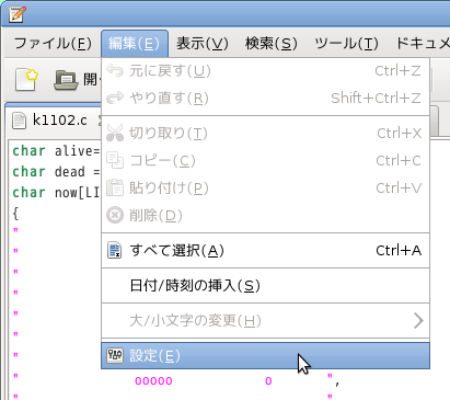この「geditの設定」を出すにはメニューから[編集]-[設定]-[フォントと色]と進みます。