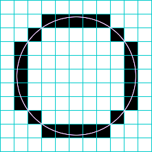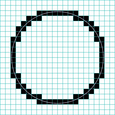 ここでは簡単にするため、白か黒かの2値で描いていますが、円が真中を通るセルは濃く、かすめるセルは薄く塗ると曲線がよりなめらかになります。