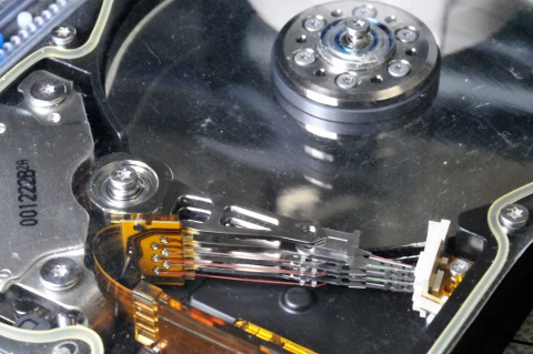 このドライブにはディスク(プラッターという)が2枚、ヘッドが4つある。ディスクが3枚、ヘッド6つまで入れられる設計になっていることがわかる。