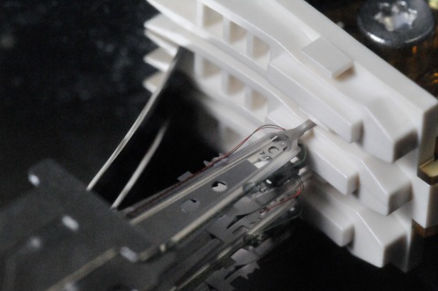 ヘッドへの配線は繊細。ヘッドはディスクを両面から挟むようになっているので、上下反対になったものが2つで1組になっている。
