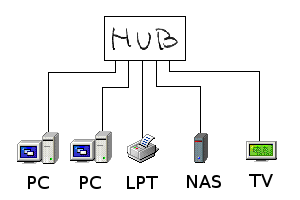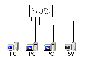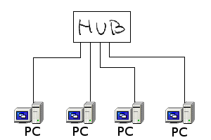 ハブ(HUB)を中心にコンピュータ(PC)をつないでネットワークを構築します。ハブとは接続の中心になるものです。ハブ空港などという言葉でよく聞くようになりました。図のPCとはパーソナルコンピュータの略。本来PC以外のコンピュータもたくさんあったので分かっている人は「PC」でなく「ホスト」という言葉を使います。