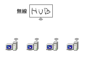 このLANケーブルによる接続を無線の電波に代えたものを無線LANといいます。この場合のHUBは無線の親機の機能を持ちますが、複数の接続をさせますからハブの機能も持ちます。