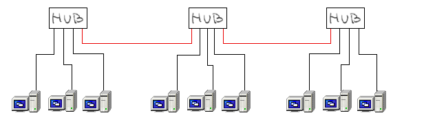 ハブには5台,8台,16台,24台の機器を接続できるものが市販されていますが、不足するときはお互いをつなぐことで接続機器を増やすことができます。ハブ同士の接続はPCなどとの接続と異なるやり方(スイッチを切り替えたり、クロスケーブルを使ったり)しますが、最近は自動認識して自分で切り替えるようになってきました。