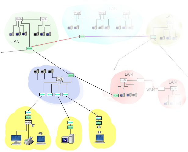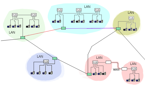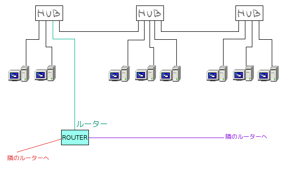 インターネットへの接続はLAN内のコンピュータの一つ(図の□)にLANの外とつなぐルーターの役割を持たせて、隣のLANのルーターとつなぎます(この接続はLANとは異なる距離に応じた方式をとります)。