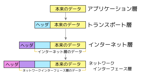 これより下の層では、それぞれのデータにその層のプロトコルに必要なヘッダが追加される。これは処理方法が書いてある封筒のようなもので、送信時には下の層へいくたびにより大きな封筒に入れられる。