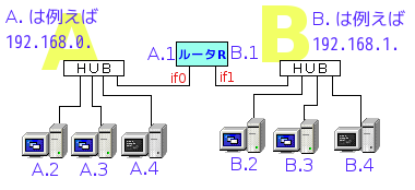 左側のネットワーク部を192.168.0. 右のネットワーク部を192.168.1. とします。 すると左のネットワークの各ホストは、192.168.0.1 とか、192.168.0.2 になるのですが、これを見やすく A.1 とか A.2 と書くことにします。