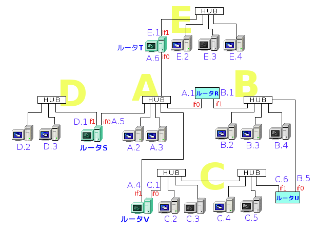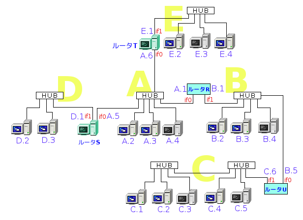 ネットワークが拡大しました。C,D,Eのネットワークをルーターで接続しています。