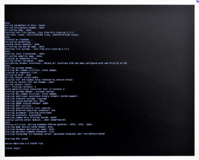 キーボードから[Ctrl]-[Alt]を同時に押しながら、[F1]キーを押すと、コマンドライン端末に切り替わりました。Linuxはこの端末が6つあります。やはり[Ctrl]-[Alt]を同時に押しながら[F1]の代わりに[F2]から[F6]までのキーを押すことで、画面が切り替わります。