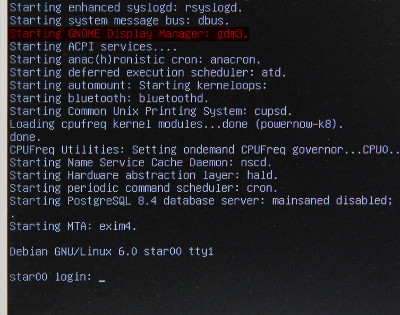 下の方に、login:の文字が見えます。ここにユーザー名を入れて[Enter]を押すと、パスワードを聞いてきます。正しくパスワードを入れると仮想でない端末からログインできます。