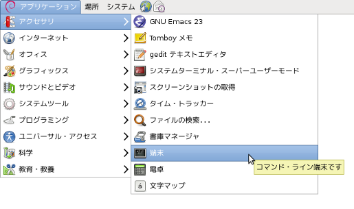 メニューの[アプリケーション]-[アクセサリ]の中の[端末]はGUIの中にCUIを作り出す「仮想端末」というものである。