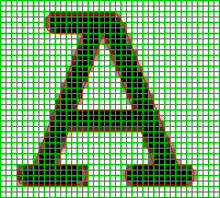 赤い線が文字の形を表す線です。緑の線が画面を作っているピクセルを表しています。この赤い枠の中にあれば100%の濃さで黒く塗り、一部がかかっていればその量に応じて薄く塗ってみました。このようにすれば拡大が自由にできます。