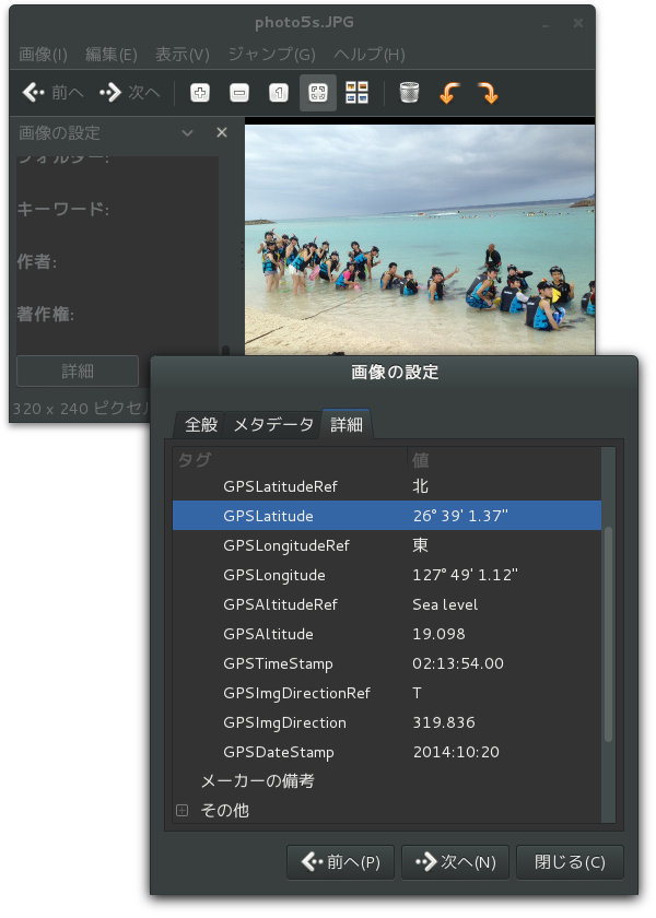 jpegの写真にはexifと呼ばれる画像以外のデータが記録されていることがあります(カメラによる)。対応しているソフトで読み出すことができます。