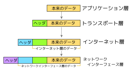 これより下の層では、それぞれのデータにその層のプロトコルに必要なヘッダが追加される。ヘッダは郵便封筒に書かれる宛先のようなもので、封筒内のデータの処理方法が書いてある。送信時には下の層へいくたびにより大きな封筒に入れられる。