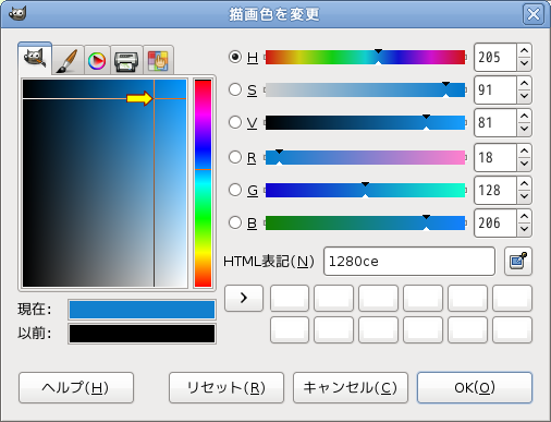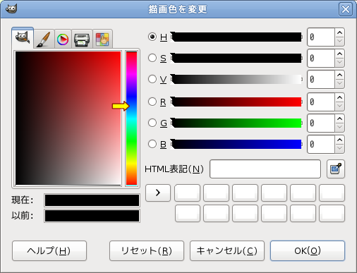 ツールボックスの色を表示するボックスをクリックすると、描画色変更のウィンドウが出ます。