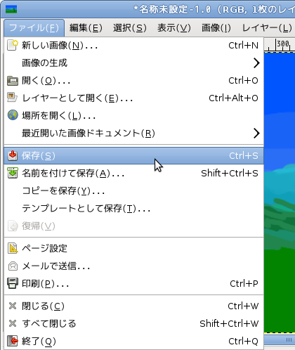 書いている画像のウィンドウ上部のメニューのファイルから保存を選びます。