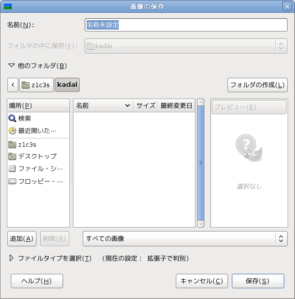 保存場所はたいていの場合ユーザーホームになっています。他の場所にするには,「他のフォルダ」をクリックして選びます。