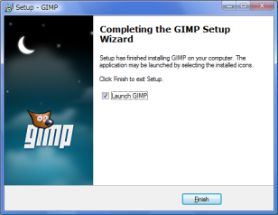Launch GIMP はGimpの起動。チェックがついたまま「finish」をクリックすると始まります。