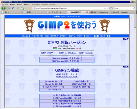 http://www.geocities.jp/gimproject/gimp2.0.html 「GIMP2を使おう」は昔から続いているサイトで,ここからダウンロードもできますし,マニュアル,チュートリアル,ギャラリー,リンク集などもあります。ただトップページで紹介している最新バージョンは2.6.3で Gimp for Windows のダウンロードに進むと置いてあるのは 2.6.4です。「本家へのリンク」と「GIMP for Windows のリンク」が目立ちます。