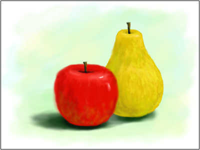 グラフィックソフトなら上に描いても水彩のように色が鮮やかさを失うことがないので、背景から描いていくとよいのですが、ナシやリンゴのできばえを見てから背景を考えたいこともあるでしょう。レイヤーを使うと簡単にできます。