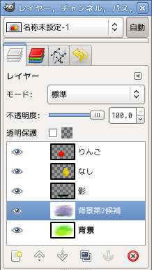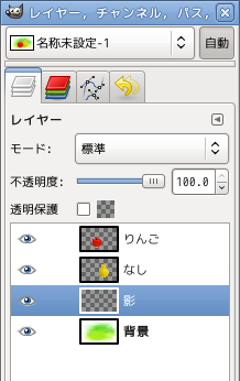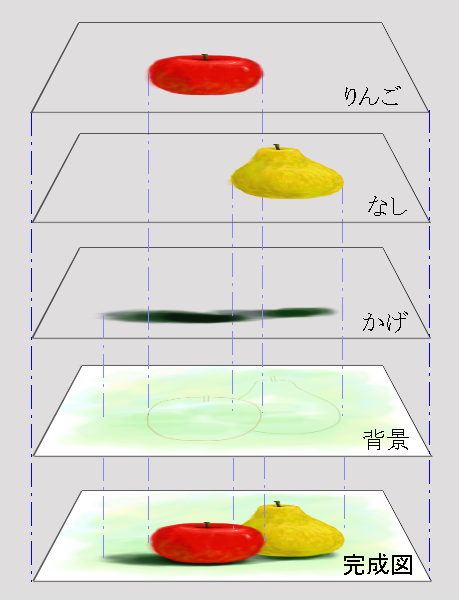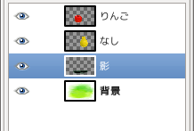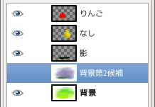 これで「りんご」と「なし」と「影」と「背景」のレイヤーが重なりました。