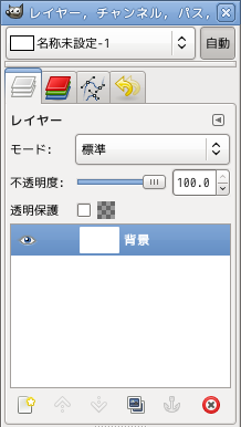 右図は「新規」で新しい紙(イメージ)を用意した直後のレイヤーのドック(ウインドウ)です。「背景」という基礎となるレイヤーが1枚だけあります。いままではこの背景に全部描いていたのです。