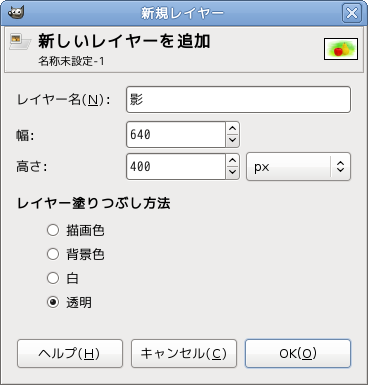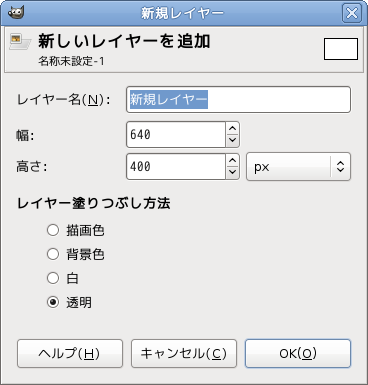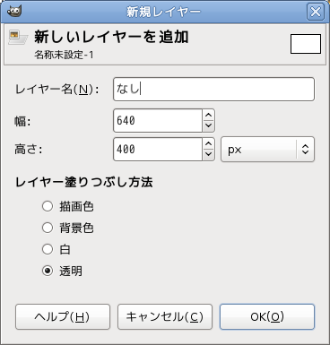 次のようなウインドウがでてきます。レイヤー名に「新規レイヤー」などと書いてあります。