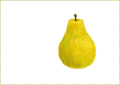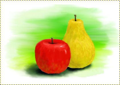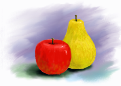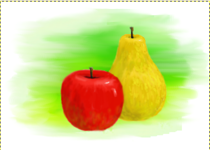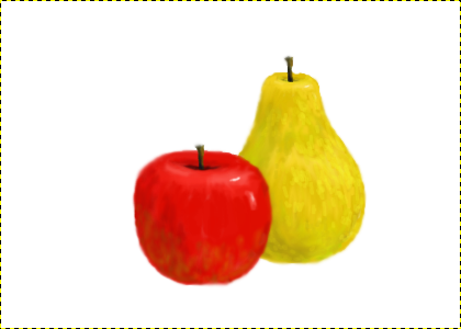 背景を描きます。「りんご」も「なし」も無視して自由に塗ってください。「りんご」や「なし」のあるところには色が入りません。ただし、「りんご」の色が透明色だったり、塗りむらがあるとそこから背景の色が漏れることはあります。
