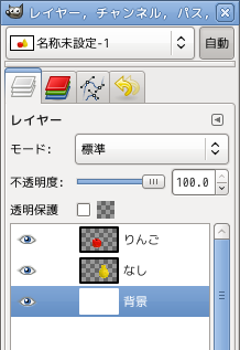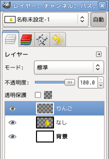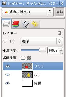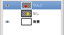 レイヤーのドック(ウインドウ)を見ると上から「りんご」「なし」「背景」となっています。