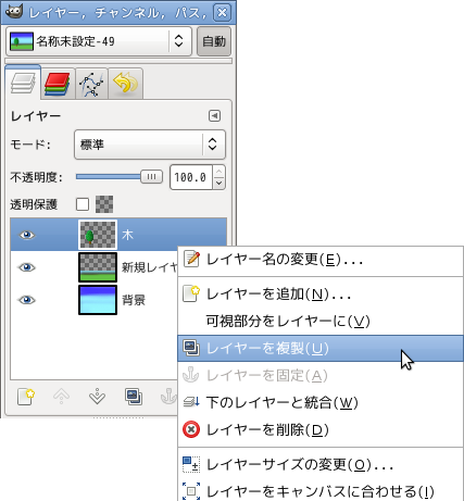 また、メニューから「レイヤー」-「レイヤーの複製」を選んでもできます。