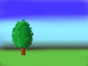 細めの筆にして木を描きます。幹を描いて、その上に緑で葉の広がりを描きます。幹も葉も明るさを3段階にすると、立体的に見えてきます。暗い色を先に木の全面に塗り、後から明るい色を重ねると塗り残しが深みをつくります。