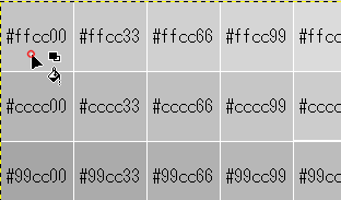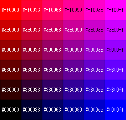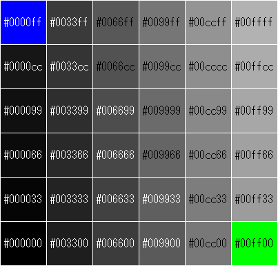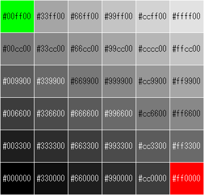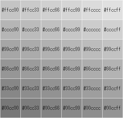 0〜255 を51ずつ分けると 0,51,102,153,204,255 というように6段階に分けることができます。この6段階を記号で、00,33,66,99,cc,ff として赤、緑、青をいろいろな強さで混ぜ合わせてみます。