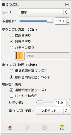 閾値(しきいち)はどのぐらい近い色だったら同じ色と見なして塗るかという許容範囲です。少なくすると塗る範囲を限定します。大きくすると思わぬ所まで塗ってしまうかもしれません。