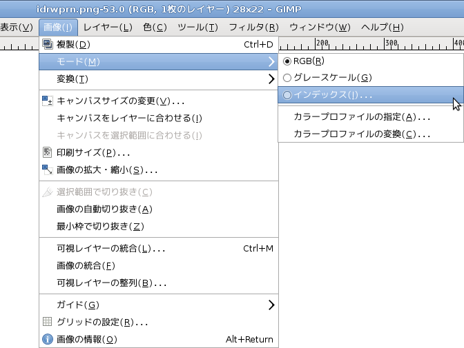 メニューの[画像]-[モード]-[インデックス]で変更されます。ちなみに普通の画像はRGBです。グレースケールは白黒の256段階の画像です。
