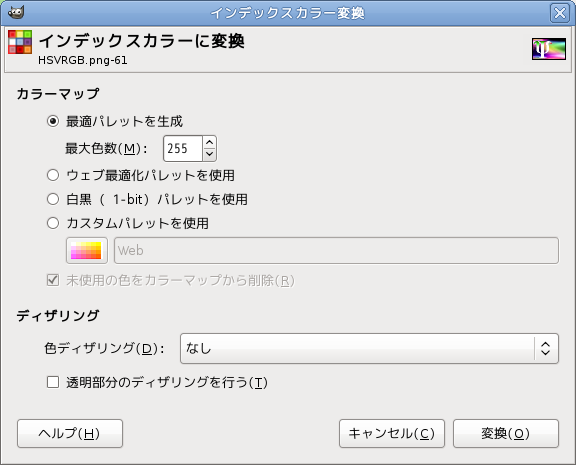 使う256色を決めます。255になっているのは透過色を考慮してのことだと思います。256より少ない色数も選べます。普通はこのまま最適パレットを生成するのがいいでしょう。