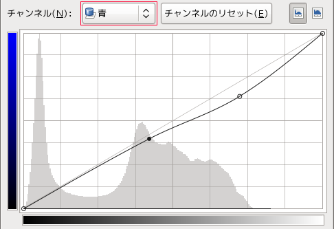 「チャンネル」の部分は初期値で「明度」になっていますが,ここを「赤」「緑」「青」と切り替えて色合いの調整もできます。図は青のカーブを下げて全体が青っぽくなっていた写真を自然な色に戻そうとしています。やりすぎると青の補色の黄色っぽくなってしまいます。