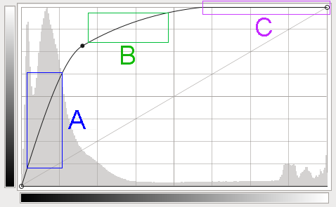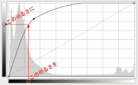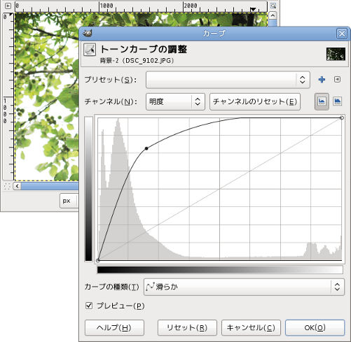 ヒストグラムを操作するツールを日本語のGIMPではトーンカーブと訳しています。英語で Color Curves なのでバージョン2.4では色カーブと訳していました。トーンは色合いとか色調の意味ですから機能をイメージできる訳になりました。色の変換のための対応を表す曲線です。