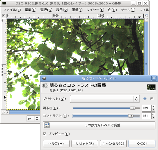 この場合は、「明るさ−コントラスト」というツールがあります。名前と機能が合致してわかりやすいツールですが、ここではあえてこれを使わずに「トーンカーブ」を使ってヒストグラムを操作する方法て行います。