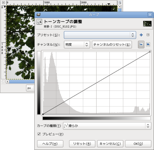 次がトーンカーブを見ます。最初トーンカーブは真ん中の左下から右上への対角線と重なっています。横軸は現在の明るさ。ヒストグラムが薄く表示されています。