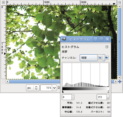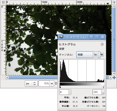 ヒストグラムとは色の統計をグラフにしたもの。メニューから[色]-[色の情報]-[ヒストグラム]で見ることができます。