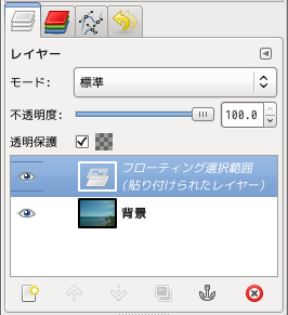 Gimpの場合,アクティブになっているレイヤーに浮遊(フローティング)している選択領域という扱いです。(このように貼り付けた画像の扱いはソフトウェアにより若干の違いがあります。)