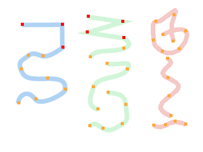 図の●のところが通過点でそこで少しだけドラッグしています。ドラッグする向きと長さで ● の間の曲線の曲がり方が変わります。