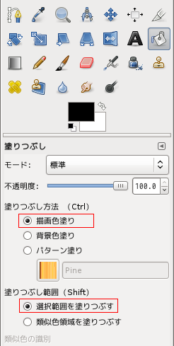 領域内部をクリックすることで、その領域が塗りつぶされます。GIMPが感知するのは矢印の先です。