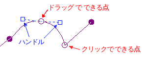 クリックしてできた点は折れ線の頂点となり、ドラッグでできた点はハンドルがついた通過点となります。