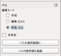 この状態でマウスをドラッグするとパス全体が移動します。[Alt]キーを押しながらでも同様の設計ですが、ウインドウマネージャーの設定によってはそうならないこともあります。(キー入力が他の機能に割り当てられていてGimpに伝えられない)