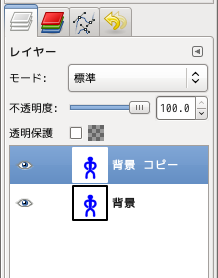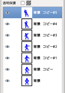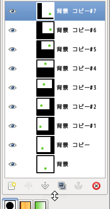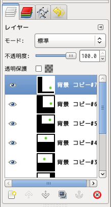 レイヤーダイアログには右のように見えています。GIMPのアニメはひとつのレイヤーがアニメの1コマではありません。一番下の背景からレイヤーをひとつずつ加えていってできる絵が1コマになります。