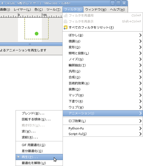 とりあえずアニメーションとして動かすには、[フィルタ]-[アニメーション]-[再生]