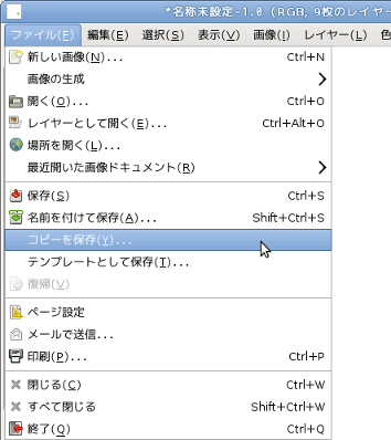 普通に「名前をつけて保存」でも保存できますが、ここでは[ファイル]-[コピーを保存]で保存することをおすすめします。[コピーを保存]は現在のファイル名(と保存するときの形式)をそのままに、データのコピーを指定したファイル名と形式で保存する機能です。こうしておけばgifで保存した後に変更を加えて「保存」したときにgifのファイルだけ更新してxcfの方を忘れたというミスを防ぐことができます